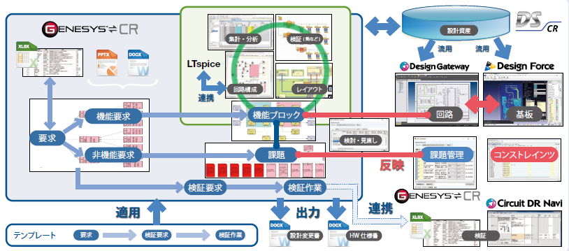 多くの文書に記載されている、エレキ設計としてやるべきこと、すなわち要求を収集・整理し、「何をすべきか」を明確化します。そして、要求を実現するための機能や検証計画を定義します。これらの情報を回路設計ツール CR-8000 Design Gateway と紐づけることにより、要求を網羅した設計結果の導出を支援します。